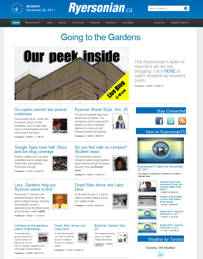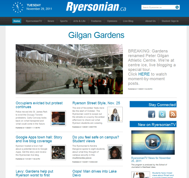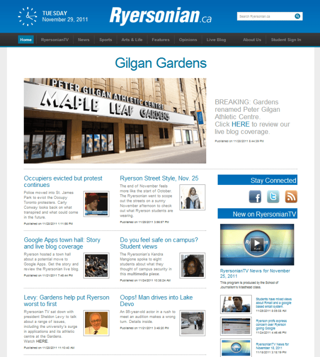 We got the blog rolling around 10 a.m. But then came breaking news that the gardens would be renamed the Ryerson Peter Gilgan Athletic Centre. We changed our top story’s headline and picture to reflect this important detail. We also took some editorial liberty and called it Gilgan Gardens.